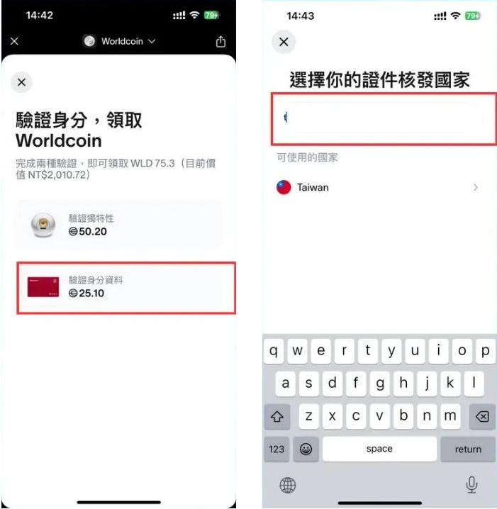 首先點選App 中的Worldcoin ,接著點選「立即驗證」,再來點選「驗證身份資料」,選擇發(fā)證的國家,