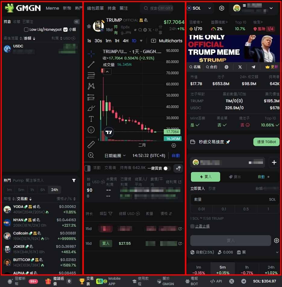 GMGN 的交易介面分為三大區(qū)域:左側(cè)欄、中間主介面右側(cè)交易設(shè)置區(qū)域,每個區(qū)域功能清晰,方便新手快速上手,進(jìn)階用戶亦能高效操作。