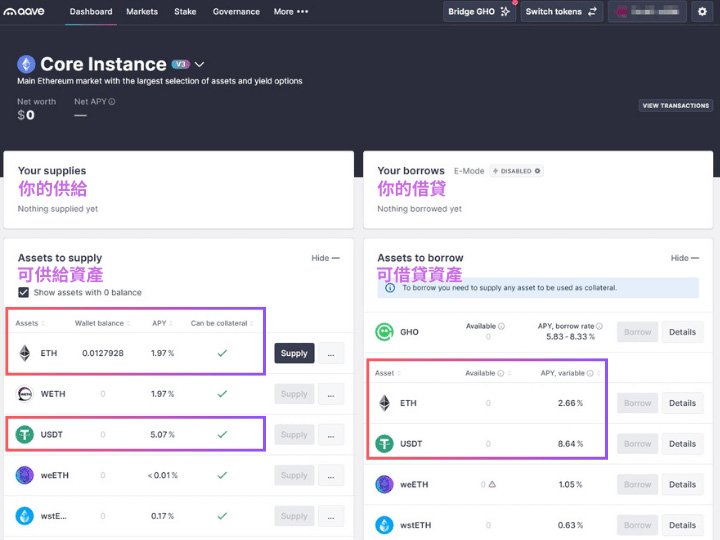 特別注意: AAVE 允許用戶提供抵押品進行借貸,每種抵押品都有不同的最高借貸價值(LTV),例如ETH 的LTV 為80.5%,表示如果存入價值100 美元的ETH,最多可借出80.5 美元的資產。
