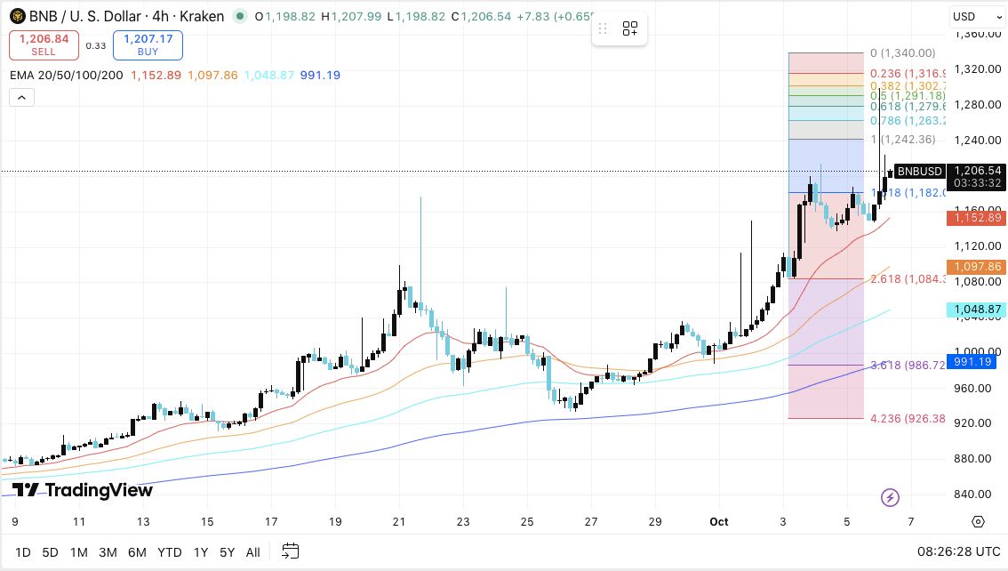 BNB(幣安幣)繼續(xù)展現(xiàn)強(qiáng)勁的看漲勢(shì)頭,維持在 1,200 美元上方。在收復(fù)這一關(guān)鍵心理區(qū)域后,該幣種的技術(shù)結(jié)構(gòu)表明持續(xù)的買(mǎi)盤(pán)壓力和穩(wěn)健的投資者信心。整體趨勢(shì)依然堅(jiān)定地看漲,BNB 的交易價(jià)格穩(wěn)居所有主要指數(shù)移動(dòng)平均線 (EMA) 之上。