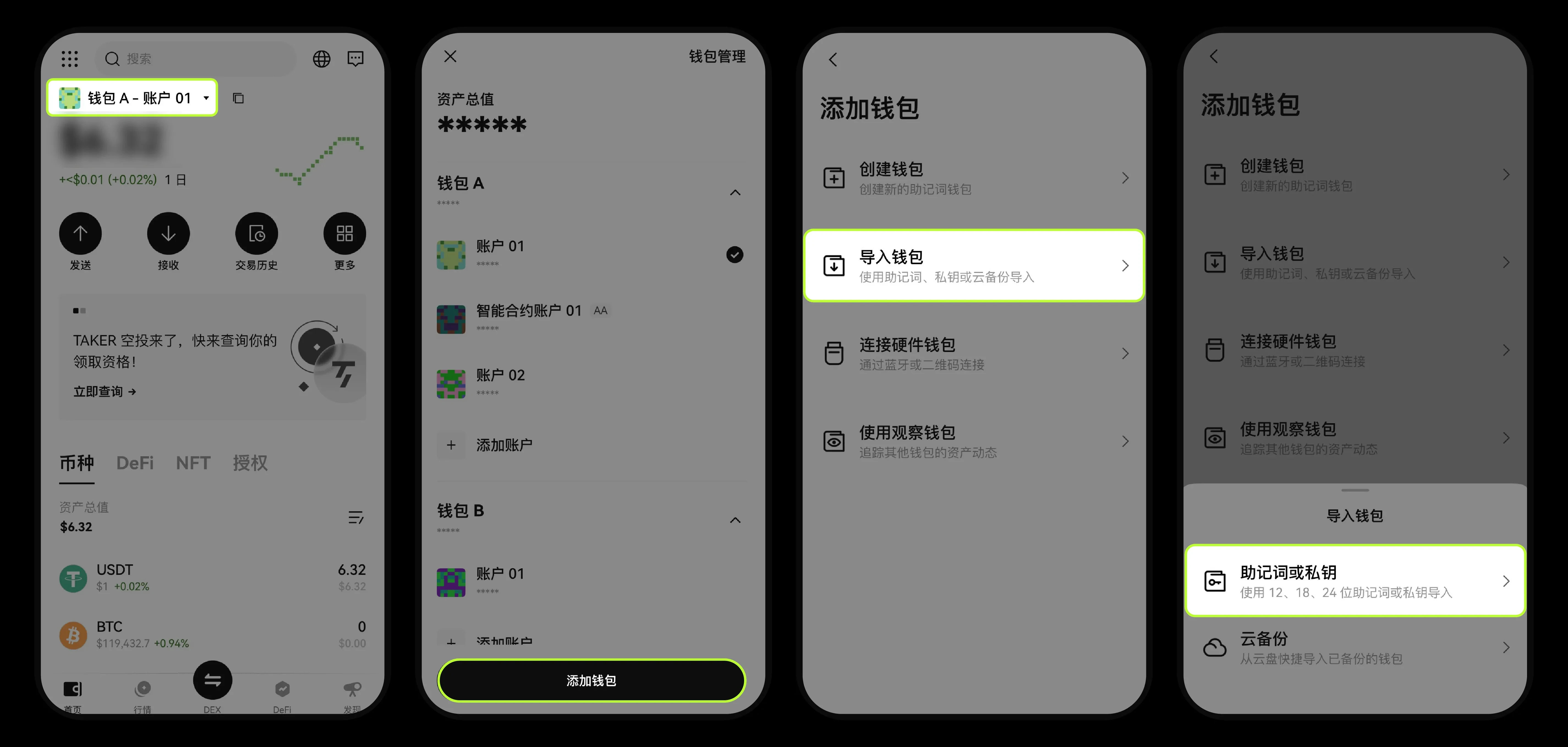 2. 點擊【導(dǎo)入錢包】—【助記詞或私鑰】,按要求完成操作。