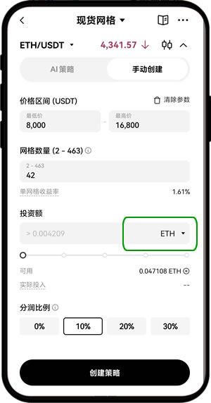 創(chuàng)建策略時(shí)注意將“投資額”設(shè)成待出貨幣種(如ETH-USDT交易對(duì)中將“投資額”選擇ETH)。