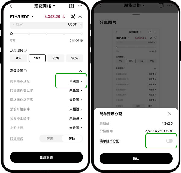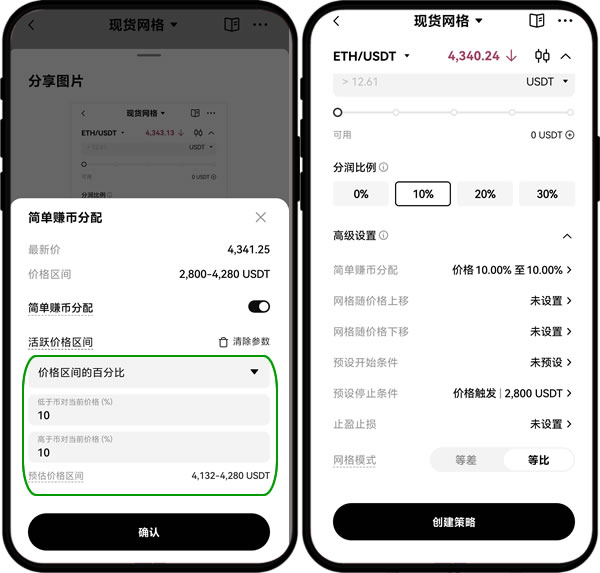 只需在創(chuàng)建策略時(shí)將“簡單賺幣分配”設(shè)置,如將價(jià)格區(qū)間的百分比設(shè)置成最小的10%(設(shè)成其它的問題不大)就可以穩(wěn)當(dāng)?shù)刭崕爬玻?/p>