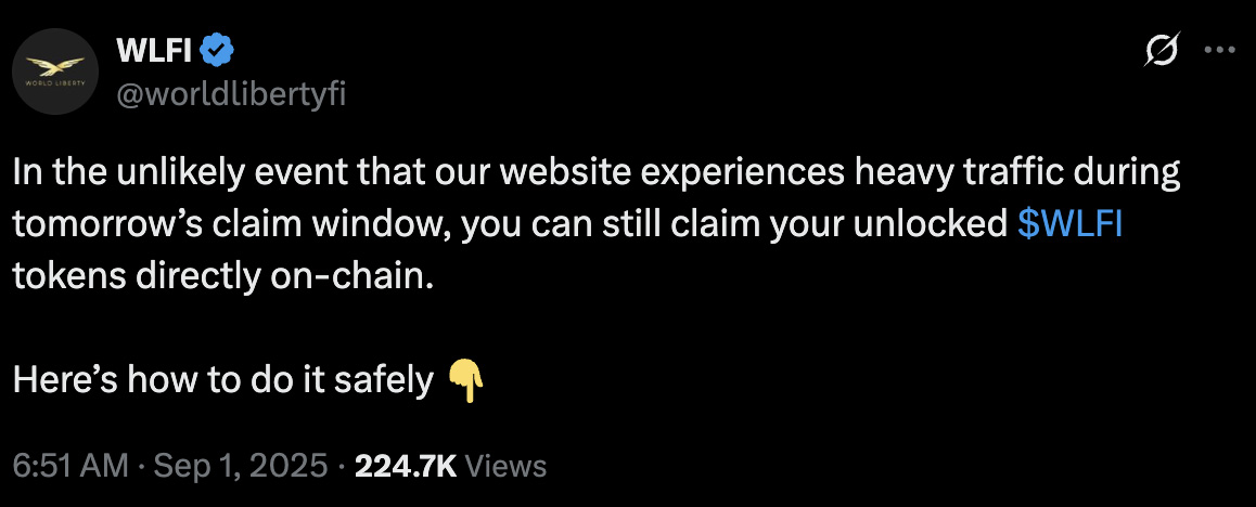 WLFI 今早表示,在今晚的領(lǐng)取視窗,若因用戶涌入導(dǎo)致官網(wǎng)壅塞,用戶仍可直接透過智能合約完成領(lǐng)幣,避免因流量問題錯失代幣最佳領(lǐng)取時間。