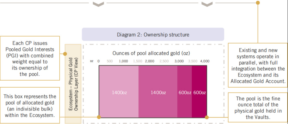 WGC提出了全新的PGI模式作為解決方案。PGI的基礎(chǔ)是一個(gè)“核心參與者”共同持有且獨(dú)立于托管機(jī)構(gòu)自有資產(chǎn)的實(shí)物金條池,其權(quán)益具有可拆分性。