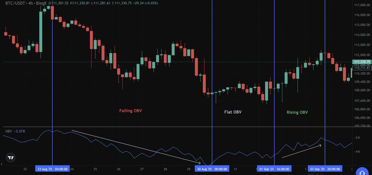 OBV 指標(biāo)在比特幣價(jià)格圖表上的應(yīng)用- 來(lái)源:BingX