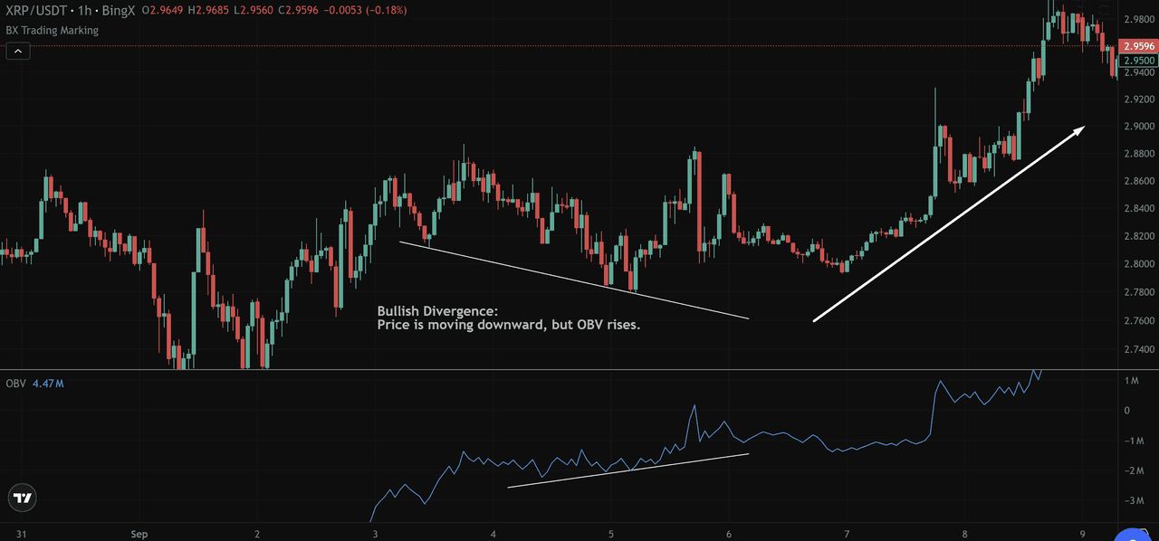 XRP價(jià)格圖表,透過(guò)OBV指標(biāo)顯示看漲背離- 來(lái)源: BingX