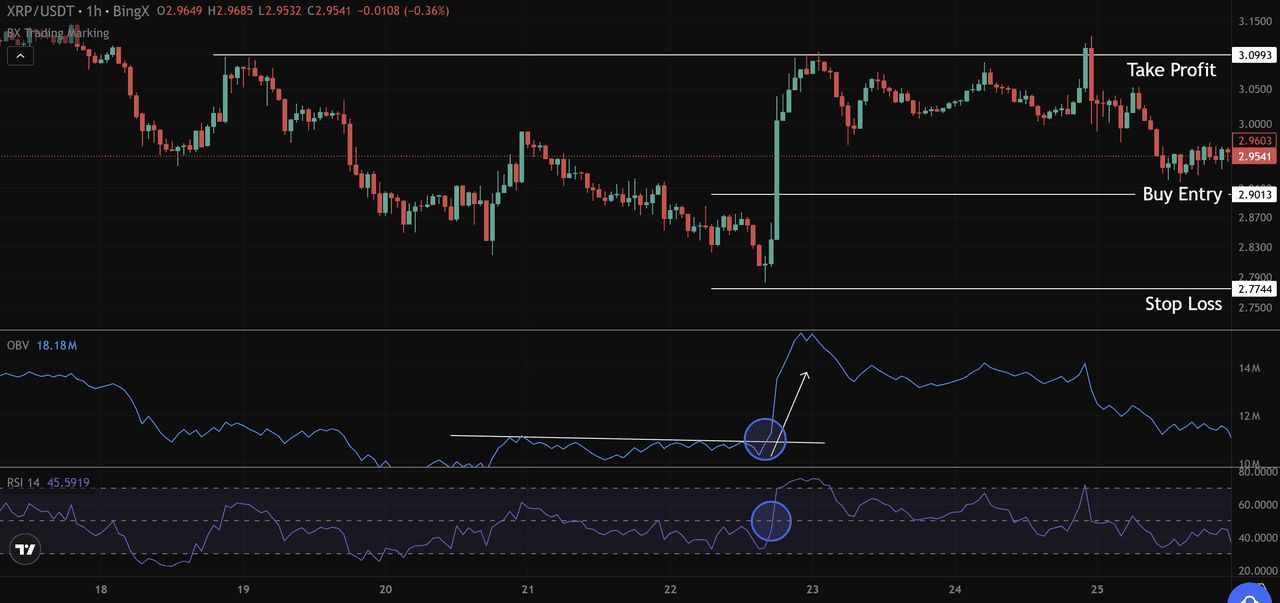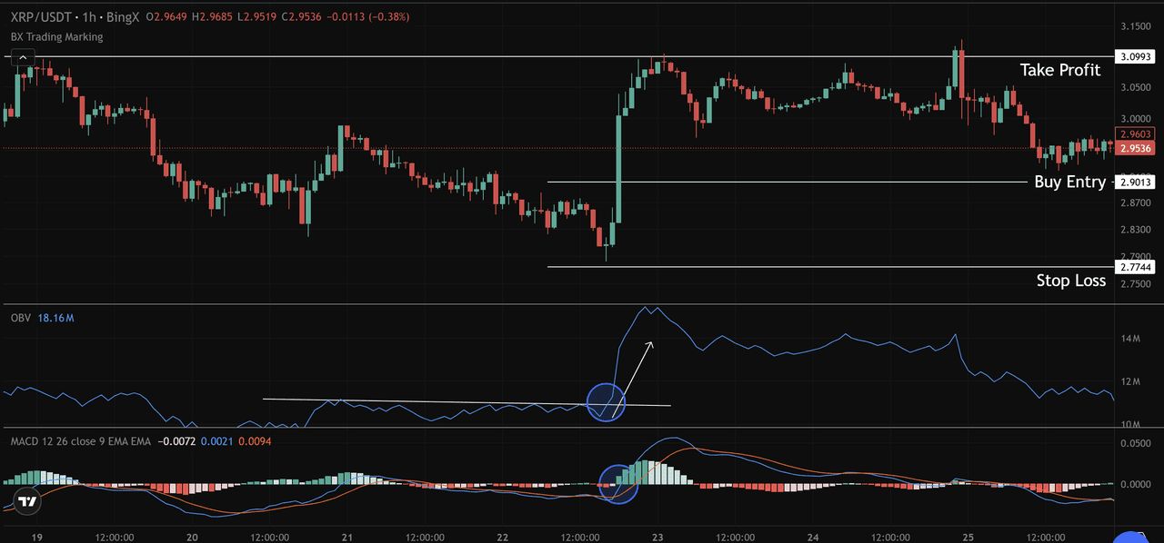 在上方XRP/USDT圖表中,OBV向上突破,同時(shí)RSI從超賣(mài)區(qū)30附近反彈并突破50。這種雙重信號(hào)證實(shí)了強(qiáng)勁的買(mǎi)盤(pán)壓力,讓交易員有信心在2.90美元附近進(jìn)場(chǎng),目標(biāo)價(jià)約為3.09美元,止損價(jià)為2.77美元。