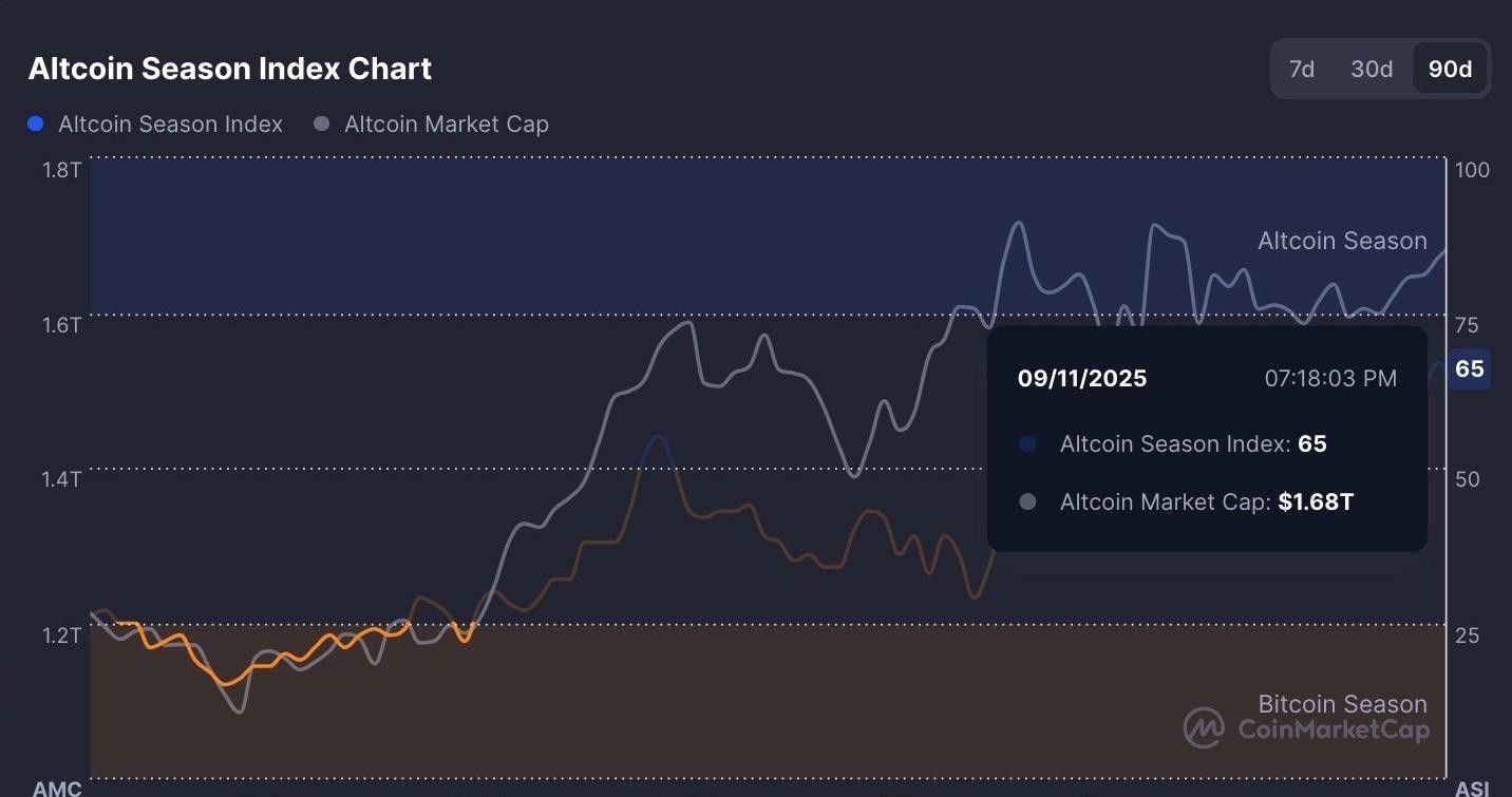 最明顯的統(tǒng)計指標(biāo)之一是山寨幣季節(jié)指數(shù),該指數(shù)已經(jīng)上漲至 65一個月前,該指數(shù)僅為 29。該指數(shù)旨在反映山寨幣相對于比特幣的表現(xiàn),持續(xù)攀升至 60 以上通常被視為有利于山寨幣突破的條件。這一走勢的速度凸顯了市場情緒已轉(zhuǎn)向高風(fēng)險投資機(jī)會。