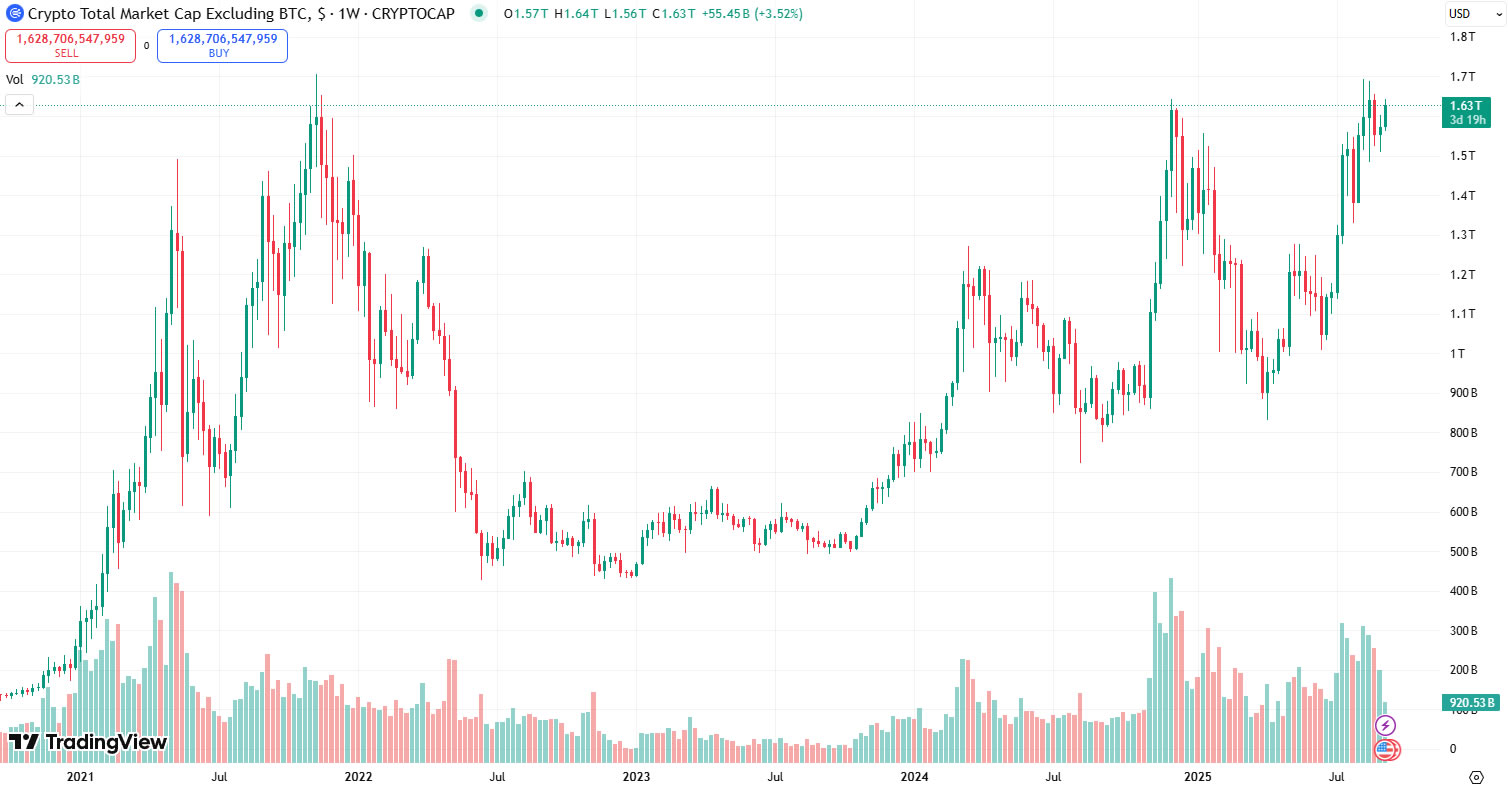 據(jù)TradingView數(shù)據(jù)顯示,目前剔除比特幣(BTC)和穩(wěn)定幣后的山寨幣總市值為1.63萬億美元,已接近歷史高點。此前高點為2024年11月的1.64萬億美元,更早前為2021年11月的1.7萬億美元。