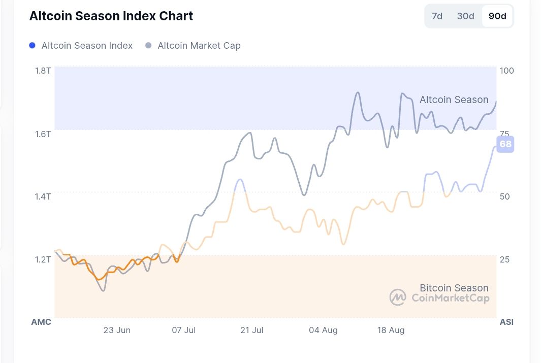 山寨幣季度指數(shù)在過去一個月中波動顯著。在8月11日跌至29點的低點后,該指數(shù)隨加密貨幣整體上漲而反彈。進(jìn)入9月,該指數(shù)曾短暫回落至50點,但在第二周迅速攀升至68點。