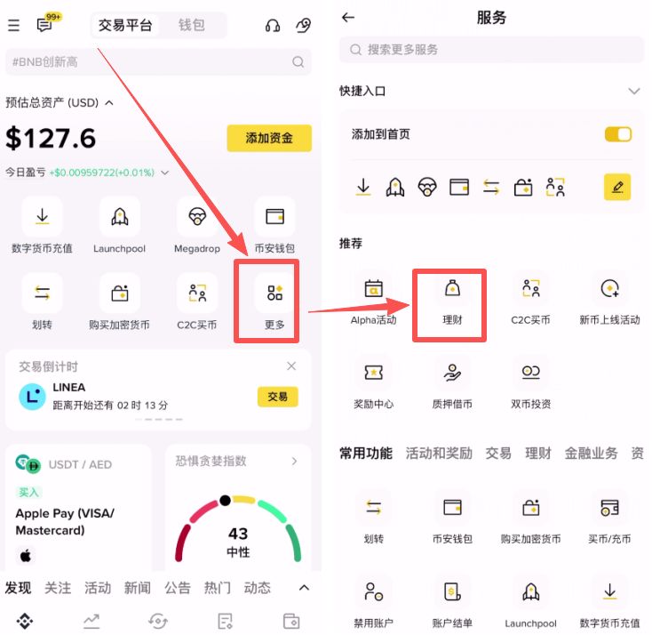 加密貨幣有一種相對比較保守的產品叫做理財賺幣。我們可以在“更多”這里找到“理財”。