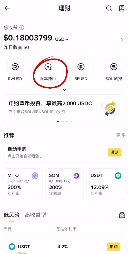 這樣之后再去申購,你的賬戶里面有余額的時候,它就會自動的把這些USDT放到賺幣產品里面。我們可以看到這個保本賺幣,它目前是活期的。