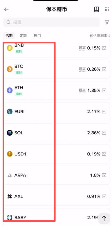 除此之外,如果你想申購(gòu)的是ETH,則需要到額外的功能頁(yè)面去做申購(gòu)。比如說(shuō)“保本賺幣”里面,它的種類會(huì)更多一些,而且一般都是活期的。