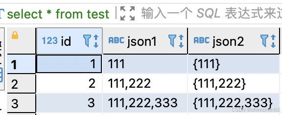 create table test ( id int, json1 varchar, json2 varchar ); insert into test values(1,'111','{111}'); insert into test values(2,'111,222','{111,222}'); insert into test values(3,'111,222,333','{111,222,333}'); select * from test;