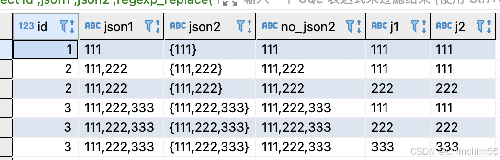 select id ,json1 ,json2 ,regexp_replace(regexp_replace(json2,'{',''),'}','') no_json2 --剔除json2外面大括號 ,regexp_split_to_table(json1,',') as j1 --使用json1來轉(zhuǎn)換結(jié)果 ,regexp_split_to_table(regexp_replace(regexp_replace(json2,'{',''),'}',''),',') as j2 --使用json2來轉(zhuǎn)換結(jié)果 from test ;