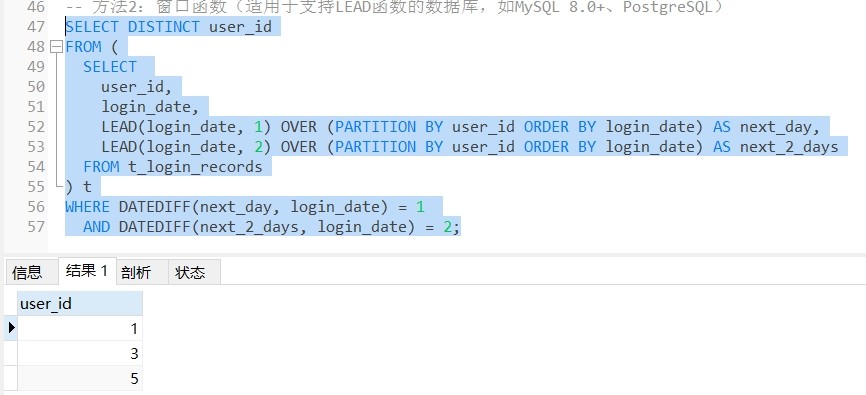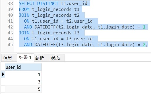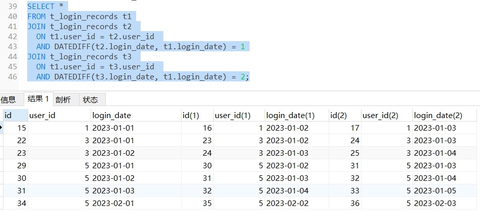 -- 方法1:自連接查詢 SELECT DISTINCT t1.user_id FROM t_login_records t1 JOIN t_login_records t2 ON t1.user_id = t2.user_id AND DATEDIFF(t2.login_date, t1.login_date) = 1 JOIN t_login_records t3 ON t1.user_id = t3.user_id AND DATEDIFF(t3.login_date, t1.login_date) = 2;