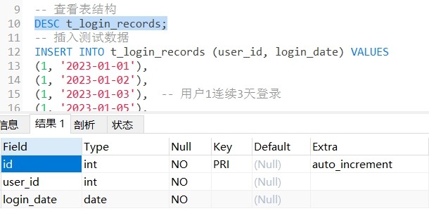 1.創(chuàng)建用戶登錄記錄表t_login_records,包含用戶 ID 和登錄日期兩個核心字段