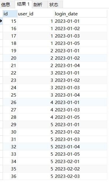 INSERT INTO t_login_records (user_id, login_date) VALUES (1, '2023-01-01'), (1, '2023-01-02'), (1, '2023-01-03'), -- 用戶1連續(xù)3天登錄 (1, '2023-01-05'), (2, '2023-01-01'), (2, '2023-01-02'), (2, '2023-01-04'), -- 用戶2不連續(xù) (3, '2023-01-01'), (3, '2023-01-02'), (3, '2023-01-03'), -- 用戶3連續(xù)3天登錄 (3, '2023-01-04'), -- 用戶3連續(xù)4天登錄 (4, '2023-01-01'), (4, '2023-01-03'), (4, '2023-01-05'), -- 用戶4不連續(xù) (5, '2023-01-01'), (5, '2023-01-02'), (5, '2023-01-03'), -- 用戶5連續(xù)3天登錄 (5, '2023-01-04'), -- 用戶5連續(xù)4天登錄 (5, '2023-01-05'), -- 用戶5連續(xù)5天登錄 (5, '2023-02-01'), -- 斷開 (5, '2023-02-02'), -- 用戶5再連續(xù)2天登錄 (5, '2023-02-03'); -- 用戶5再連續(xù)3天登錄 SELECT * FROM t_login_records;