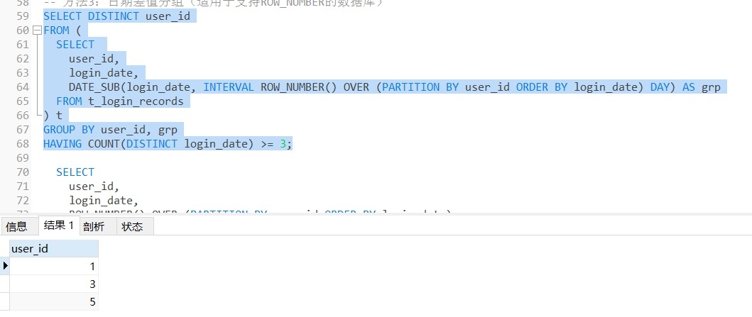 user_id和grp分組,統(tǒng)計每組的日期數(shù)量,若≥3則為連續(xù)登錄。