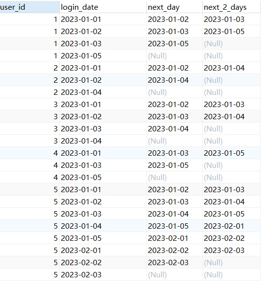 LEAD(login_date, 1):獲取當前記錄的下一條日期。LEAD(login_date, 2):獲取當前記錄的下兩條日期。- 確保