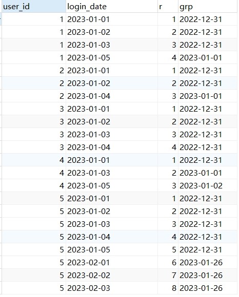 DATE_SUB(login_date, INTERVAL ROW_NUMBER() OVER (PARTITION BY user_id ORDER BY login_date) DAY) AS grp