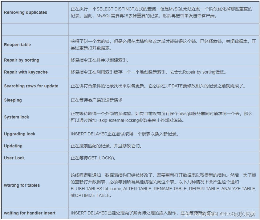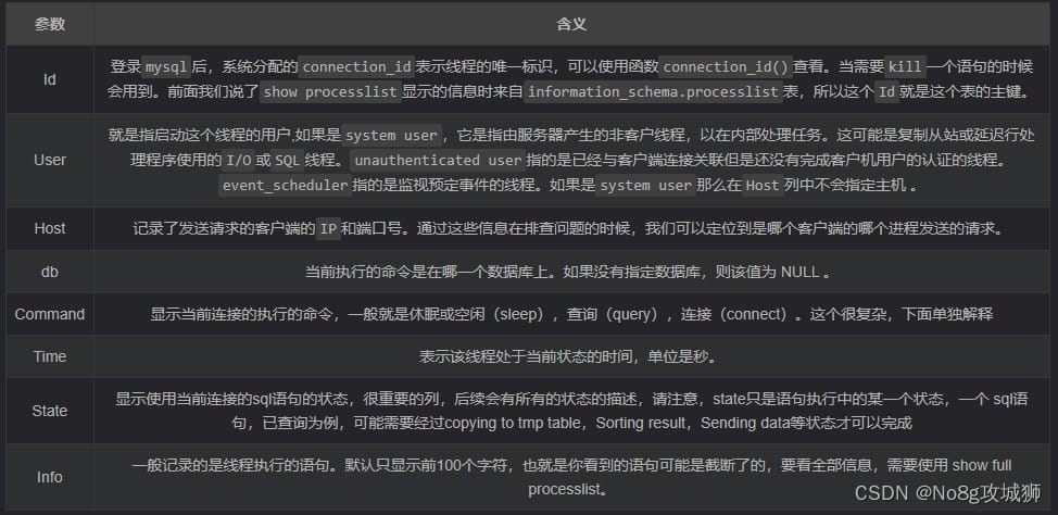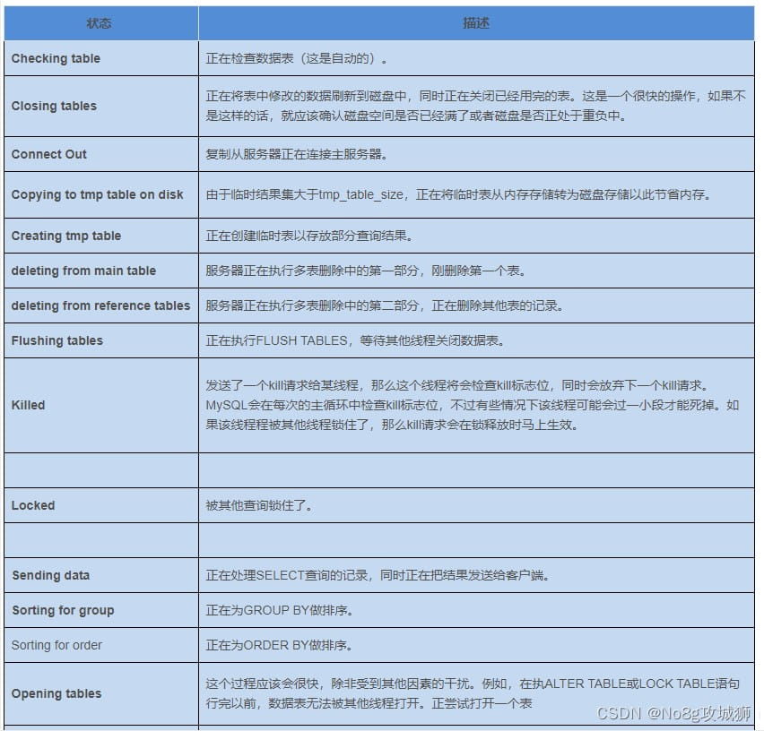 對(duì)于一個(gè)MySQL連接,或者說(shuō)一個(gè)線(xiàn)程,任何時(shí)刻都有一個(gè)狀態(tài),該狀態(tài)表示了MySQL當(dāng)前正在做什么。SHOW PROCESSLIST 命令的含義便是顯示哪些線(xiàn)程正在運(yùn)行。