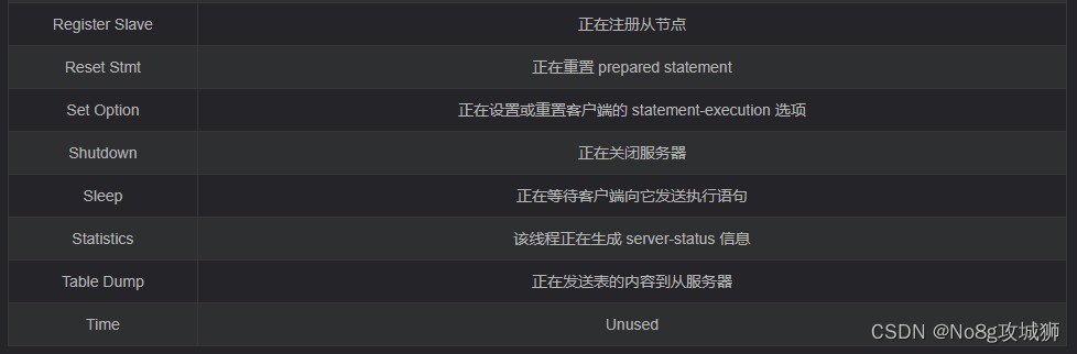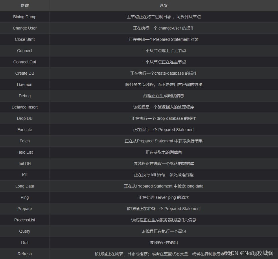 Command當(dāng)前執(zhí)行的命令類(lèi)型,如 Query(查詢(xún))、Sleep(休眠)等
