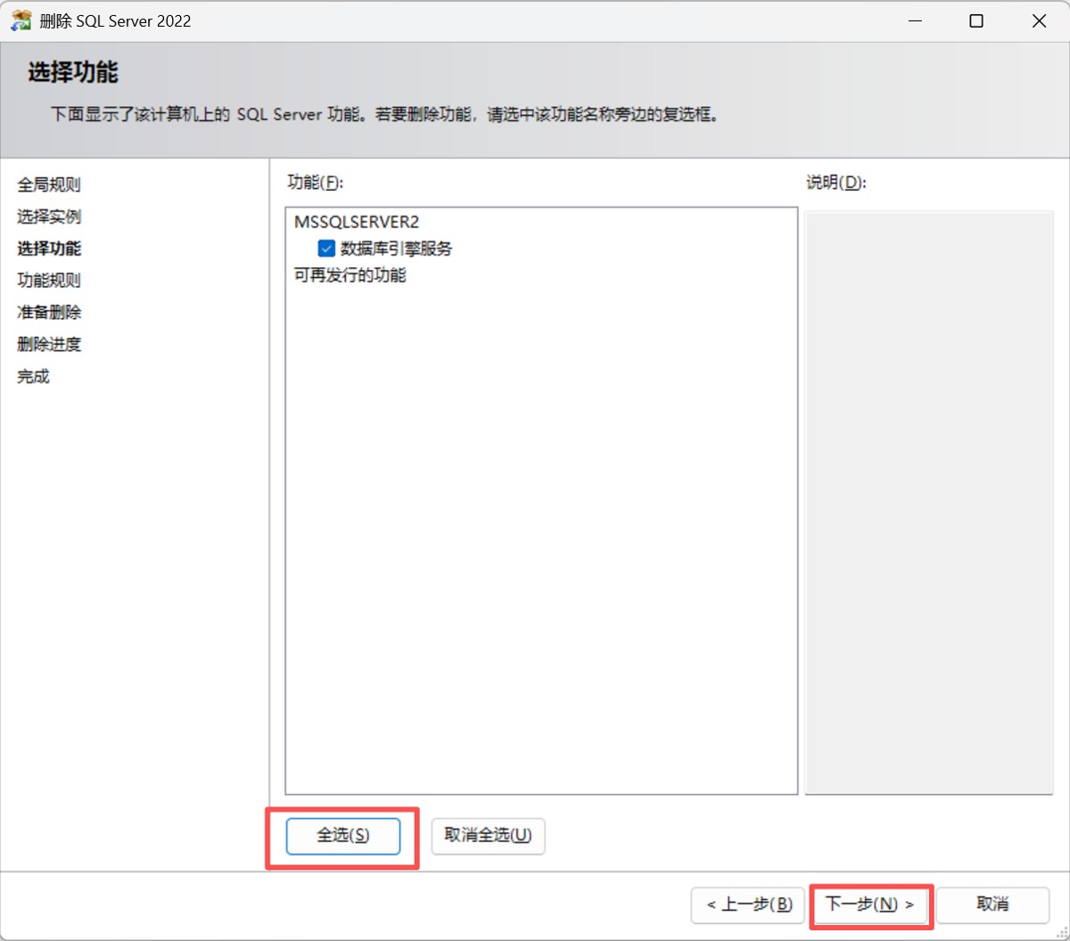 然后點擊“全選”(或按需選擇要卸載的功能),點擊下一步,最后點擊刪除、完成即可。