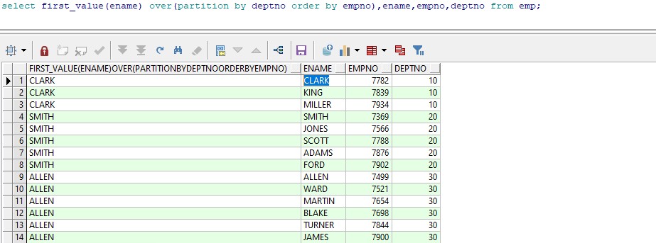 select first_value(ename) over(partition by deptno order by empno),ename,empno,deptno from emp;