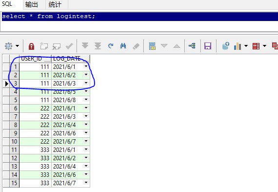 create table logintest(user_id number,log_date date); insert into logintest values(111,to_date(‘2021-06-01',‘yyyy-mm-dd')); insert into logintest values(111,to_date(‘2021-06-02',‘yyyy-mm-dd')); insert into logintest values(111,to_date(‘2021-06-03',‘yyyy-mm-dd')); insert into logintest values(111,to_date(‘2021-06-05',‘yyyy-mm-dd')); insert into logintest values(111,to_date(‘2021-06-08',‘yyyy-mm-dd')); insert into logintest values(222,to_date(‘2021-06-01',‘yyyy-mm-dd')); insert into logintest values(222,to_date(‘2021-06-03',‘yyyy-mm-dd')); insert into logintest values(222,to_date(‘2021-06-04',‘yyyy-mm-dd')); insert into logintest values(222,to_date(‘2021-06-06',‘yyyy-mm-dd')); insert into logintest values(222,to_date(‘2021-06-07',‘yyyy-mm-dd')); insert into logintest values(333,to_date(‘2021-06-01',‘yyyy-mm-dd')); insert into logintest values(333,to_date(‘2021-06-02',‘yyyy-mm-dd')); insert into logintest values(333,to_date(‘2021-06-04',‘yyyy-mm-dd')); insert into logintest values(333,to_date(‘2021-06-06',‘yyyy-mm-dd')); insert into logintest values(333,to_date(‘2021-06-07',‘yyyy-mm-dd')); commit;