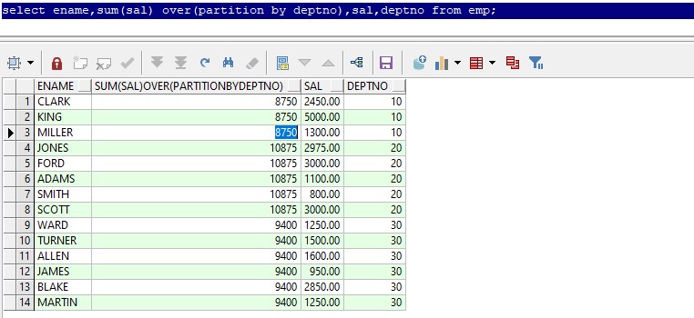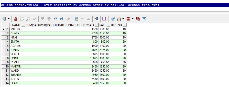 select ename,sum(sal) over(partition by deptno order by sal),deptno from emp;