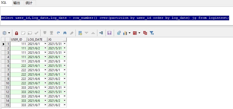 select user_id,log_date,log_date - row_number() over(partition by user_id order by log_date) jg from logintest;