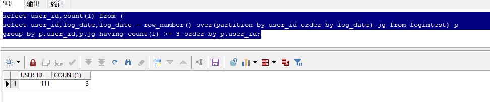 select user_id,count(1) from ( select user_id,log_date,log_date - row_number() over(partition by user_id order by log_date) jg from logintest) p group by p.user_id,p.jg having count(1) >= 3 order by p.user_id;