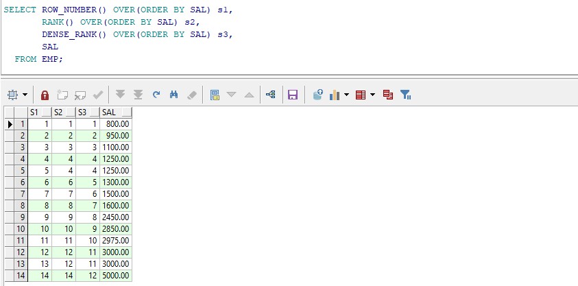 SELECT ROW_NUMBER() OVER(ORDER BY SAL) s1, RANK() OVER(ORDER BY SAL) s2, DENSE_RANK() OVER(ORDER BY SAL) s3, SAL FROM EMP;