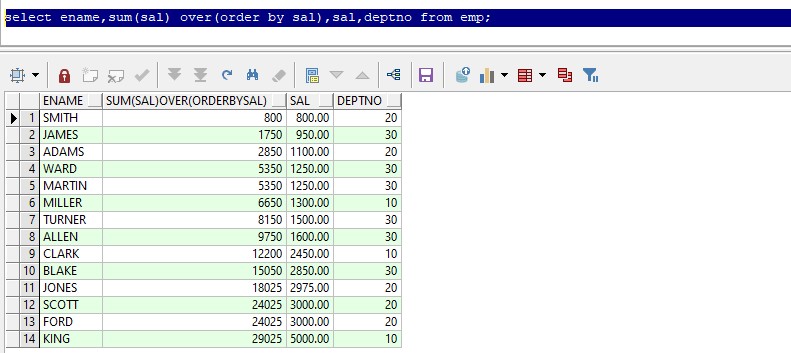 sum(sal) over(order by sal )只排序,默認(rèn)是從第一行累加到當(dāng)前行,如:第一行為運(yùn)行效果: