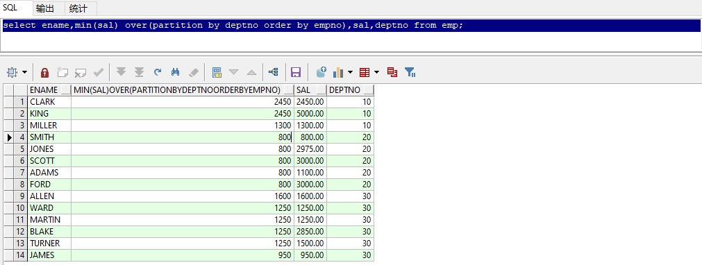 select ename,min(sal) over(partition by deptno order by empno),sal,deptno from emp;