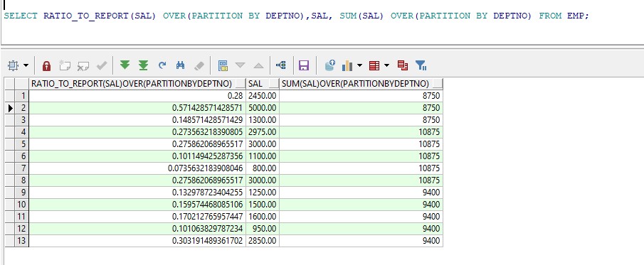 SELECT RATIO_TO_REPORT(SAL) OVER(PARTITION BY DEPTNO),SAL, SUM(SAL) OVER(PARTITION BY DEPTNO) FROM EMP;