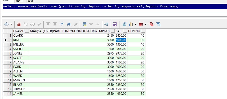 例:進(jìn)行組內(nèi)排序,獲取各部門中第一行的員工姓名,10部門第一行的員工姓名為CLARK。運(yùn)行效果: