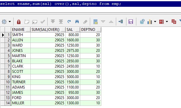 sum(sal) over()不分組不排序則,獲取全公司工資的總和,使用效果與聚合函數(shù)sum()一致,但是結(jié)果有多條。運(yùn)行效果:
