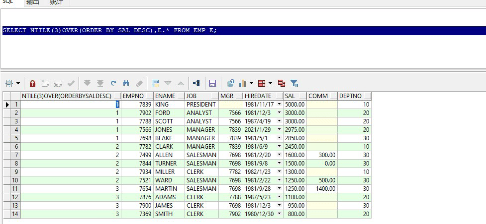 例:按工資降序排序,分為三個(gè)級(jí)別(NTILE(3)),系統(tǒng)會(huì)自動(dòng)劃分。運(yùn)行效果: