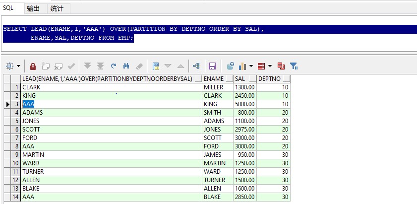 SELECT LEAD(ENAME,1,‘AAA') OVER(PARTITION BY DEPTNO ORDER BY SAL), ENAME,SAL,DEPTNO FROM EMP;