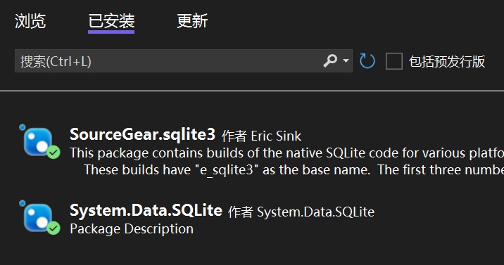 System.Data.SQLite 可在 nuget.org 上獲取。典型用法通常需要添加兩個 NuGet 包:一個用于 System.Data.SQLite,另一個包含 SQLite 的本機構(gòu)建(例如 System.Data.SQLite.Core)。例如: