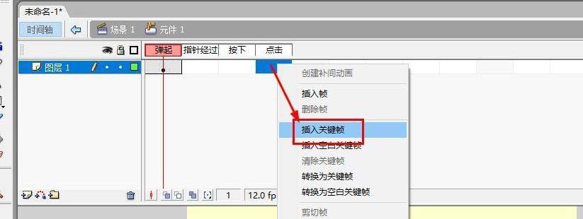 6、這時(shí)可以看到時(shí)間軸變成4個(gè)幀,前三個(gè)幀分別是彈起,鼠標(biāo)經(jīng)過(guò)及按下,最后一個(gè)幀是點(diǎn)擊,也就是點(diǎn)擊區(qū)域,在第4幀插入關(guān)鍵幀