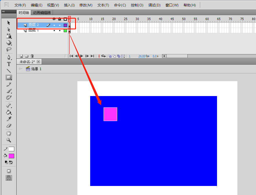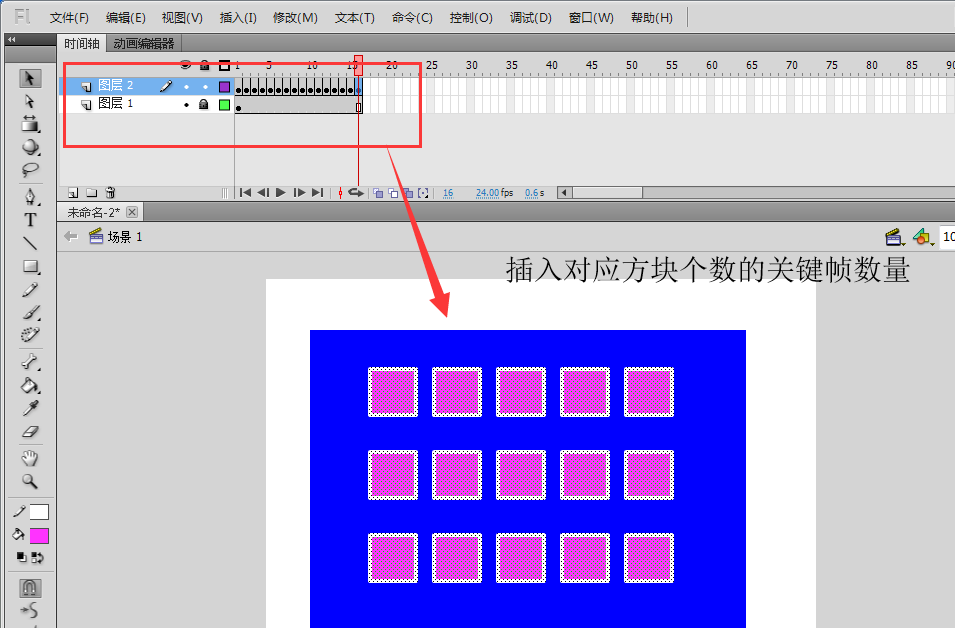 5、在圖層2上根據(jù)小方塊的個數(shù)多少插入相同數(shù)量的關鍵幀,并將圖層1的背景的時間軸延長到相同長度。