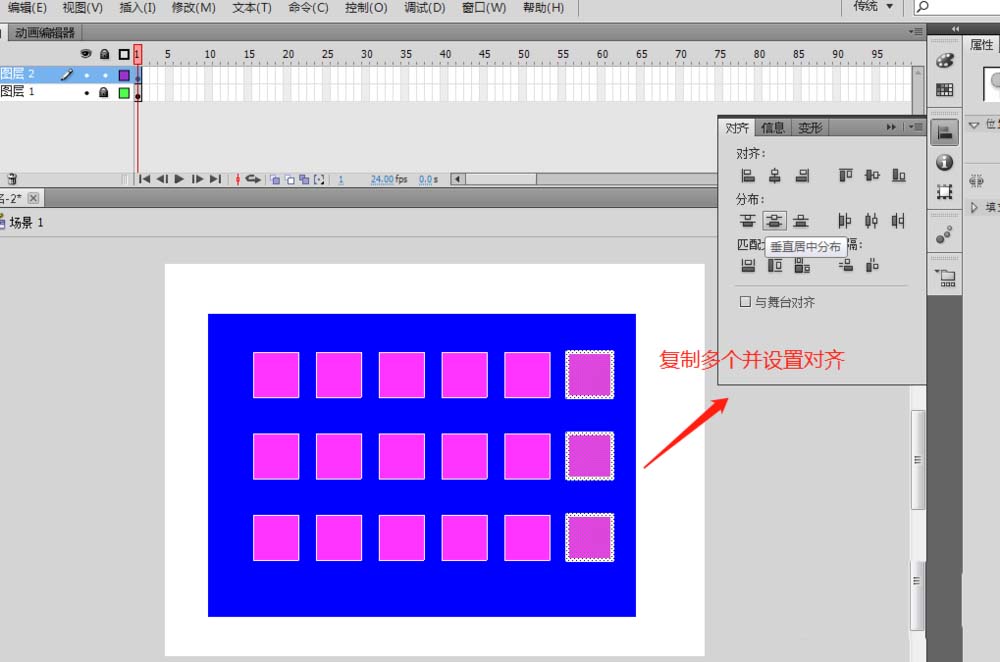 4、選中這個繪制的小方塊圖形進行復制出來多個,并在對齊面板中設置這些小方塊對齊分布。