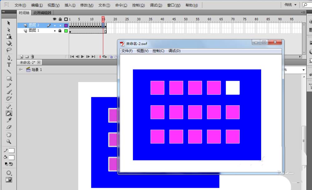 6、然后依次單擊選中圖層2的每一個關鍵幀,使用顏料桶工具對應更改一個方塊的顏色。全部改完之后測試動畫,就看到跑馬燈的流動方塊逐幀動畫效果了。