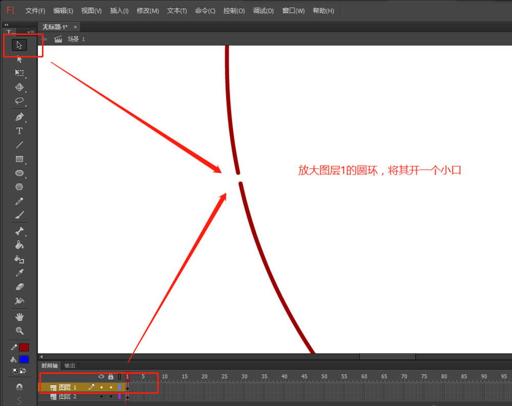 4、選中圖層1的圓環(huán),將舞臺畫面進行放大,然后用選擇工具將圓環(huán)的一小部分進行選中并deleta刪除留出一個小口出來。
