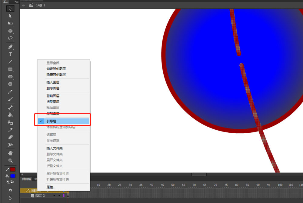 5、將圓環(huán)的圖層1設(shè)置為引導(dǎo)層,將圖層2的小球設(shè)置為被引導(dǎo)圖層。