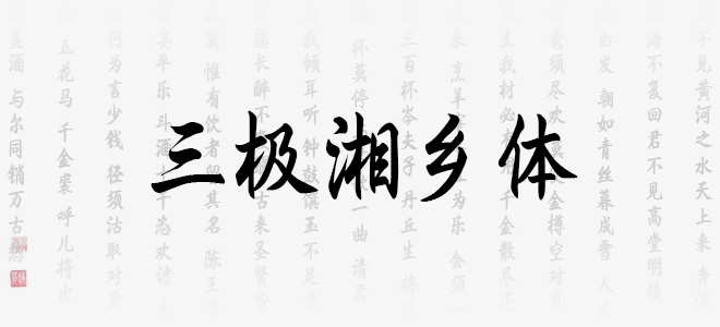 三極湘鄉(xiāng)體頗有湖南人刀剛火辣的特征,個(gè)性十分鮮明,書寫嚴(yán)謹(jǐn),筆畫從容。適用于傳統(tǒng)印刷媒介的標(biāo)題與正文排版,尤其適用于古典、工藝類型行業(yè)和書籍裝幀。